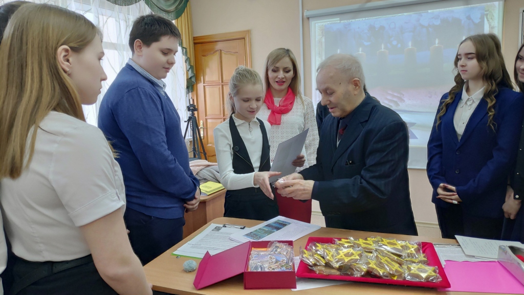 Почетным гостем и экспертом выступил Роман Борисович Файн, который не только по ходу урока давал ребятам разъяснения таких понятий как гетто, геноцид, праведники народов мира, но еще и прочитал свои собственные произведения, отражающие жизненный опыт, знание событий, пережитых и прочувствованных автором.